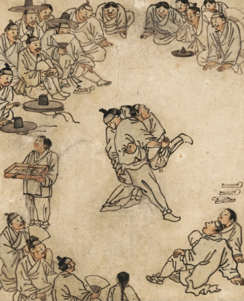 김홍도는 조선 후기의 대표적인 화가로, 풍속화의 대가로 잘 알려져 있습니다. 그러나 그의 그림을 자세히 들여다보면 단순한 궁중 화풍이나 사대부 중심 회화와는 다른, 민화적 감수성이 깃든 대중적인 시선을 엿볼 수 있습니다. 그의 대표작 중 하나인 《씨름》이나 《서당》 같은 작품은 일상 속 서민의 삶을 사실적이고도 따뜻하게 묘사합니다. 이는 민화가 민중의 염원과 삶의 단면을 담아낸 것과 통하는 점이 많습니다. 굳이 미술사적 전문 용어를 몰라도, 그림을 보는 이로 하여금 '이해하고 웃을 수 있는' 정서가 담겨 있다는 점에서, 김홍도의 그림은 민화처럼 쉬운 접근성과 감정 전달력을 지니고 있다고 할 수 있습니다. 특히 인물들의 익살스러운 표정과 과장된 동작, 단순하지만 생동감 넘치는 구성은 민화가 지닌 해학적 요소와도 맞닿아 있습니다. 이런 점에서 김홍도의 풍속화는 단순한 기록화를 넘어, 서민의 삶을 예술로 끌어올린 민화적 회화로도 해석될 수 있습니다.